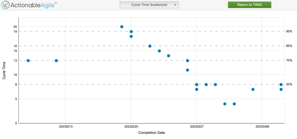 For instance the team in the previous scatterplot example completed 19 items in the period of time shown. To get the 85th percentile, multiply 19 by 85% (0.85).
